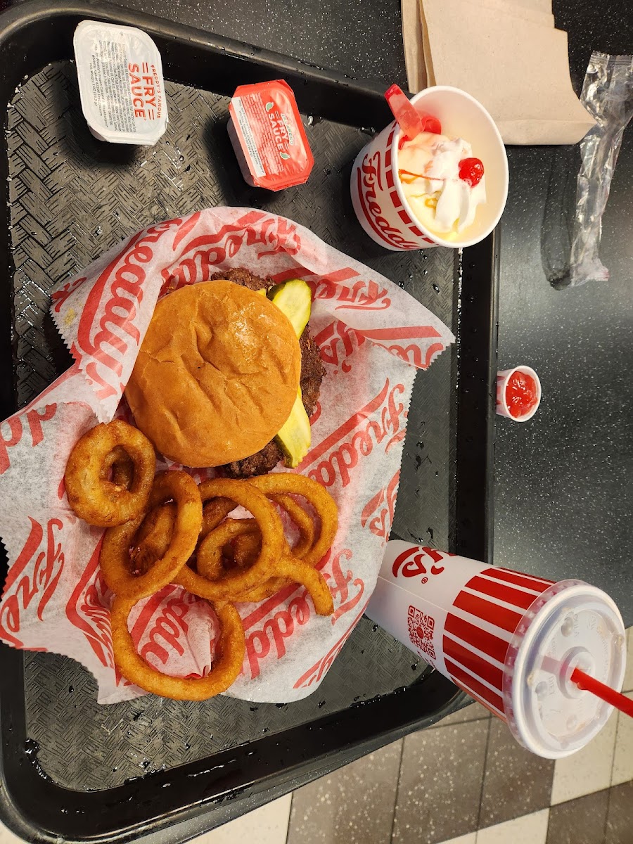 The sides are equally enticing! Try the crispy Onion Rings or the classic Freddy's Fries seasoned with their special Steakburger & Fry Seasoning, ensuring every bite bursts with flavor. For a hearty treat, the Chili Cheese Fries topped with rich chili and jalapeño cheese sauce are a crowd-pleaser at just $6.35.
